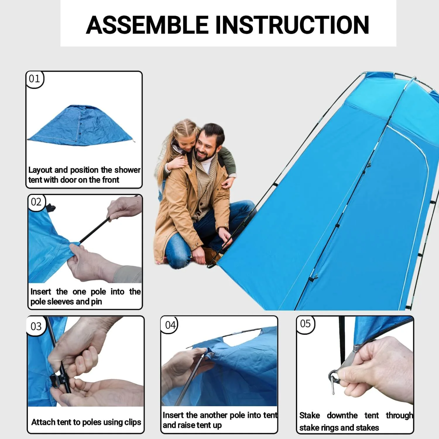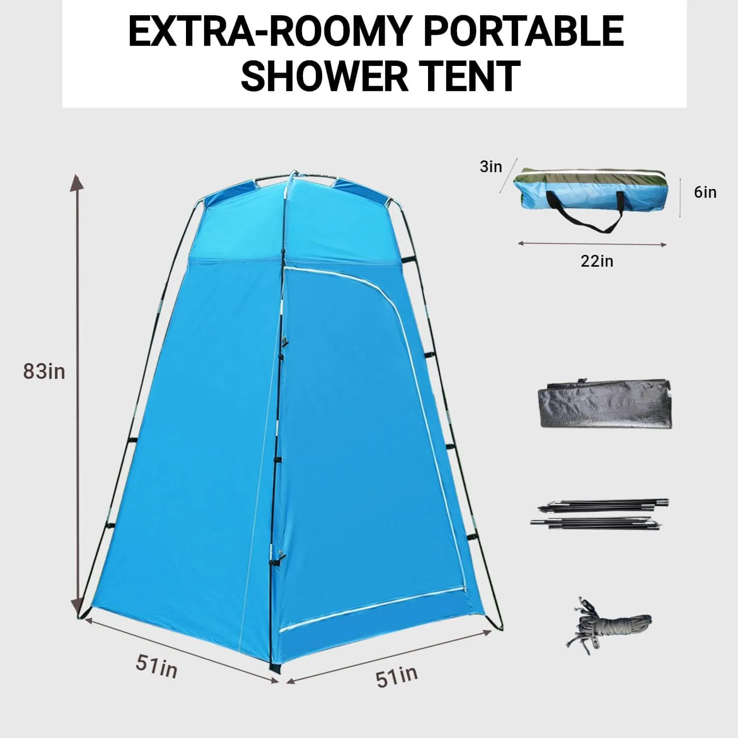 WHAT’S IN THE PACKAGE? This package includes 1 shower canopy, 2 frame poles, 8 stakes, 4 guy lines, 1 carabiner and 1 storage bag. Weighing just 4.8 pounds, it can be folded into a compact size of 22″ L x 6″ W x 3″ H.